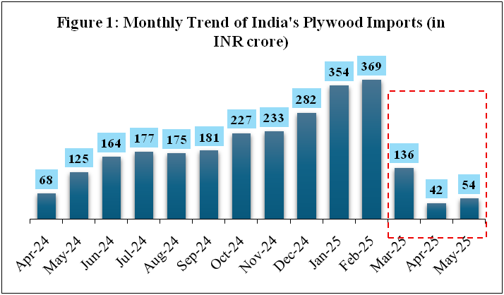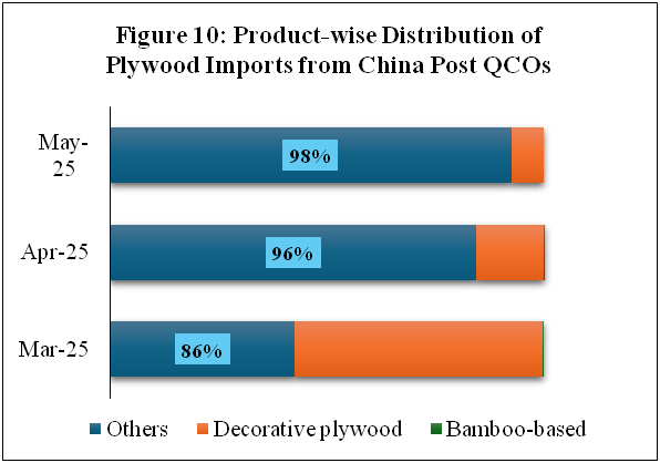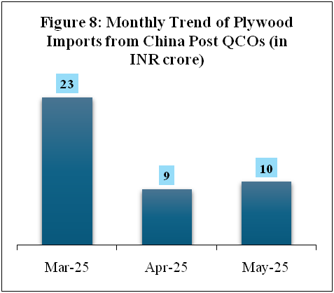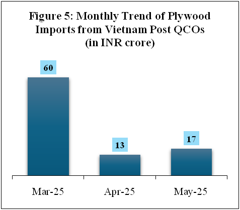 Following the implementation of the QCOs, India’s plywood imports stood at a reduced level of INR 136 crore in March, which further dropped to INR 42 crore and INR 54 crore in April and May 2025, respectively. At first glance, the decline in import figures suggests that the QCOs are effectively restricting the entry of plywood products into India that originate from foreign manufacturers without BIS licenses. However, considering that very few foreign manufacturers have been granted BIS licenses so far, these import volumes still appear relatively high, indicating that some non-BIS-compliant products may continue to enter India even after the enforcement of the QCOs.