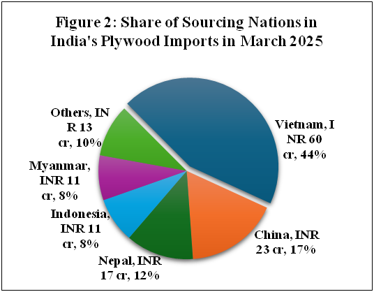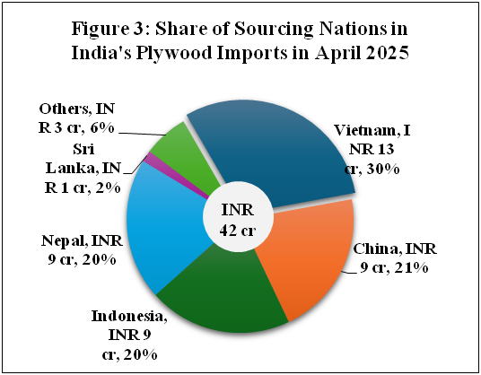 The source-country distributions of India’s plywood imports for March, April and May 2025 are presented in Figures 2, 3 and 4.