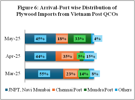 The arrival-port-wise distribution of plywood imports from Vietnam during the post QCOs period shows that Jawaharlal Nehru Port (Nhava Sheva) in Navi Mumbai emerged as the largest entry point, handling nearly half of the total shipments. Specifically, the port accounted for 55%, 44% and 45% of total plywood volumes arriving from Vietnam in March, April and May 2025, respectively. It was followed by Chennai and Mundra ports, which also became siginificant entry points for Vietnamese plywood after the implementation of the QCOs.