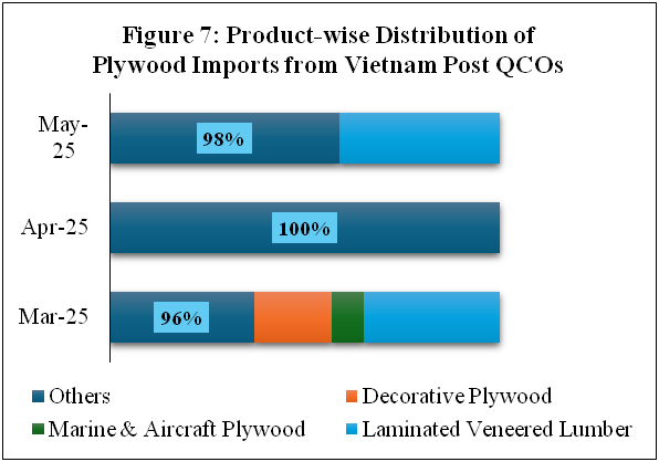 Further, the product-wise distribution of plywood imports from Vietnam after the implementation of the QCOs (as shown in Figure 7) reveals some surprising patterns. Most plywood products entering the Indian market have been classified under the ‘Others’ sub-category of HSN Code 4412. Specifically, 96% of imports in March, 100% in April and 98% in May were classified under this sub-category when exported to India.