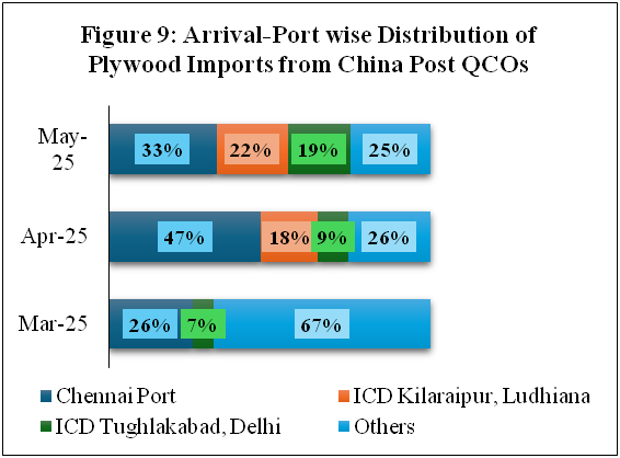 The arrival-port-wise distribution of plywood imports from China following the implementation of the QCOs indicates that a substantial share of these shipments was handled by Chennai Port, establishing it as the primary entry point for Chinese plywood. Specifically, Chennai Port managed 26%, 47% and 33% of the total shipments from China in March, April and May 2025, respectively. In April and May 2025, Chennai Port was followed by Inland Container Depot (ICD) Kilaraipur, Ludhiana and ICD Tughlakabad, Delhi, both of which handled notable volumes of plywood imports from China.