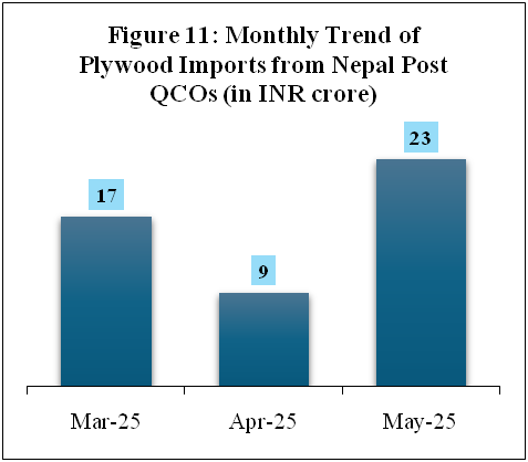 The product-wise distribution of plywood imports from China (as shown in Figure 10) reveals trends similar to those observed in the case of Vietnam. A majority of these imports have been classified under the ‘Others’ sub-category of HSN code 4412. The share of this sub-catgeory in total plywood imports from China increased steadily month-over-month, reaching 98% in May 2025, up from 86% in March and 96% in April. This persistent reliance on the ‘Others’ sub-category raises concerns about potential misclassification and circumvention of mandatory BIS certification requirements.