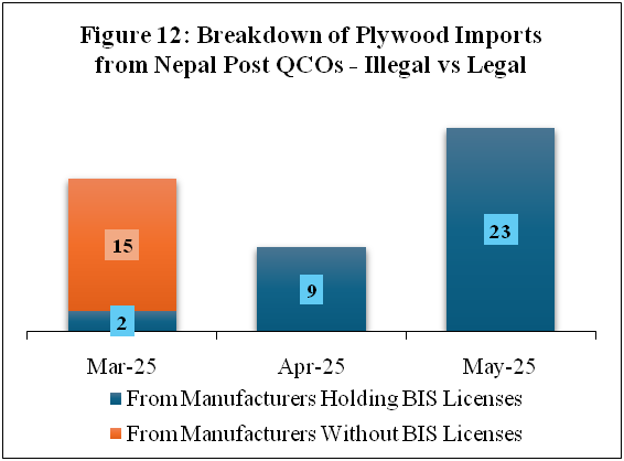 The above analysis highlights that despite the implementation of the QCOs in February 2025, most of the plywood imports from Nepal in March 2025 originated from manufacturers lacking BIS licenses. Furthermore, the abnormal surge in exports from Nepal-based manufacturers holding BIS licenses in May 2025 indicates a strong possibility that non-BIS-compliant plywood from Nepal is entering India under the cover of certified material. It appears that manufacturers holding BIS licenses are misusing their licenses to facilitate the entry of illegal plywood of non-BIS manufacturers into India, thereby undermining the primary objective of the QCOs.