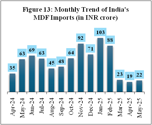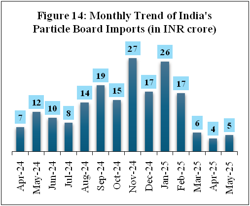 Figures 13 and 14 present the month-wise trend analysis of India’s imports of medium-density fibreboard (MDF) and particle board. Just prior to the implementation of the QCOs, MDF imports stood at INR 88 crore in February 2025. This value declined siginificantly to INR 23 crore in March, followed by INR 19 crore in April and INR 22 crore in May 2025. A similar downtrend was observed in the particle board segment. Imports of particle board amounted to INR 17 crore in February, decreasing to INR 6 crore in March, INR 4 crore in April and INR 5 crore in May 2025.