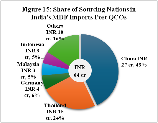 Following the implementation of the QCOs, China emerged as the leading source country for India’s MDF imports, contributing 43% of the total import value – amounting to INR 27 crore. Other major source countries included Thailand, Germany, Malaysia and Indonesia.