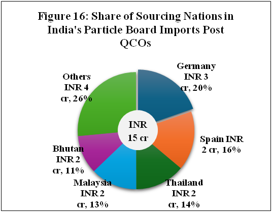 The source-country-wise distributions of India’s MDF and particle board imports during the post-QCOs period (March, April and May 2025 combined) are shown in Figures 15 and 16.